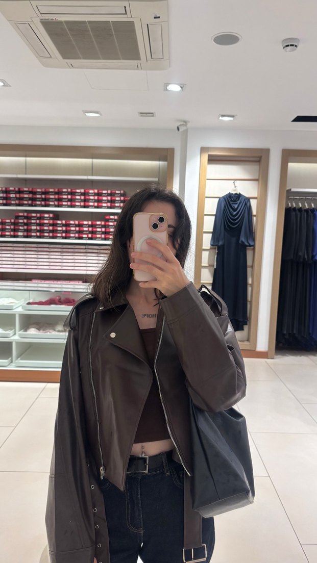 Kahverengi deri ceket, bol kesim, uzun kollu ve yüksek yakalıdır. Günlük kullanım için sokak tarzını yansıtan rahat ve şık bir parçadır.