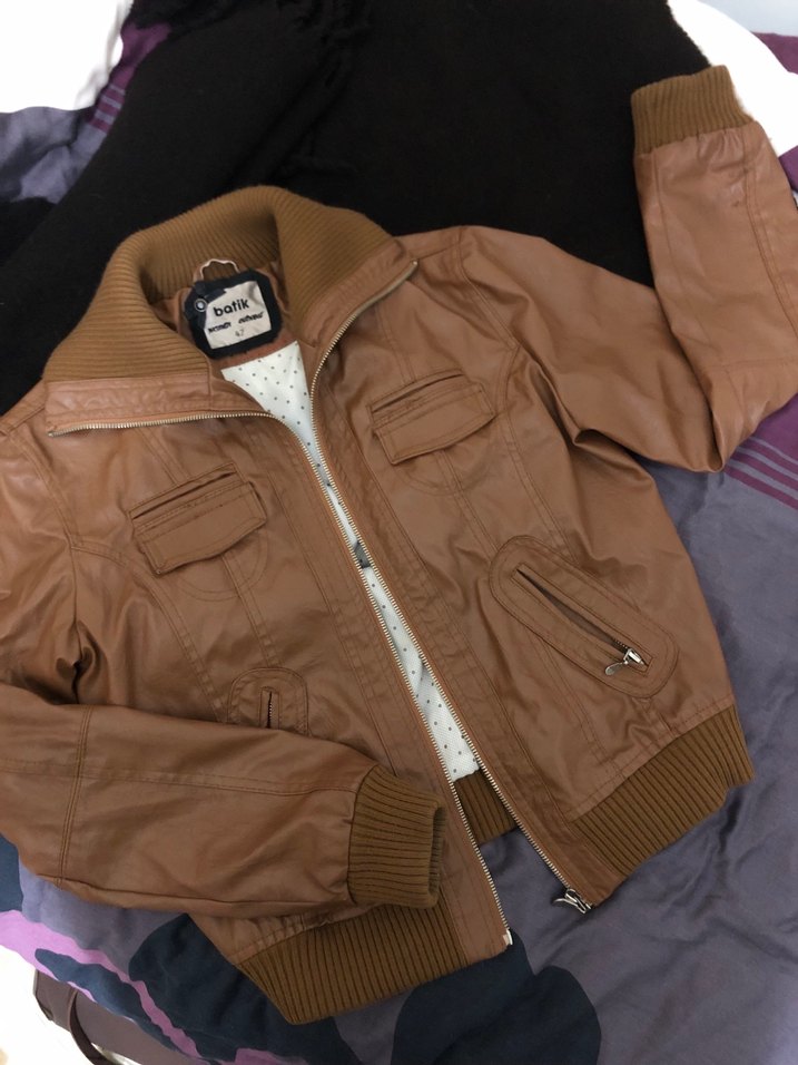 Uzun kollu, kahverengi deri ceket. Oturmalı kesim, kayışlı detaylar ve parlak yüzey. Notched yakalı, sokak stiline uygun bir model.