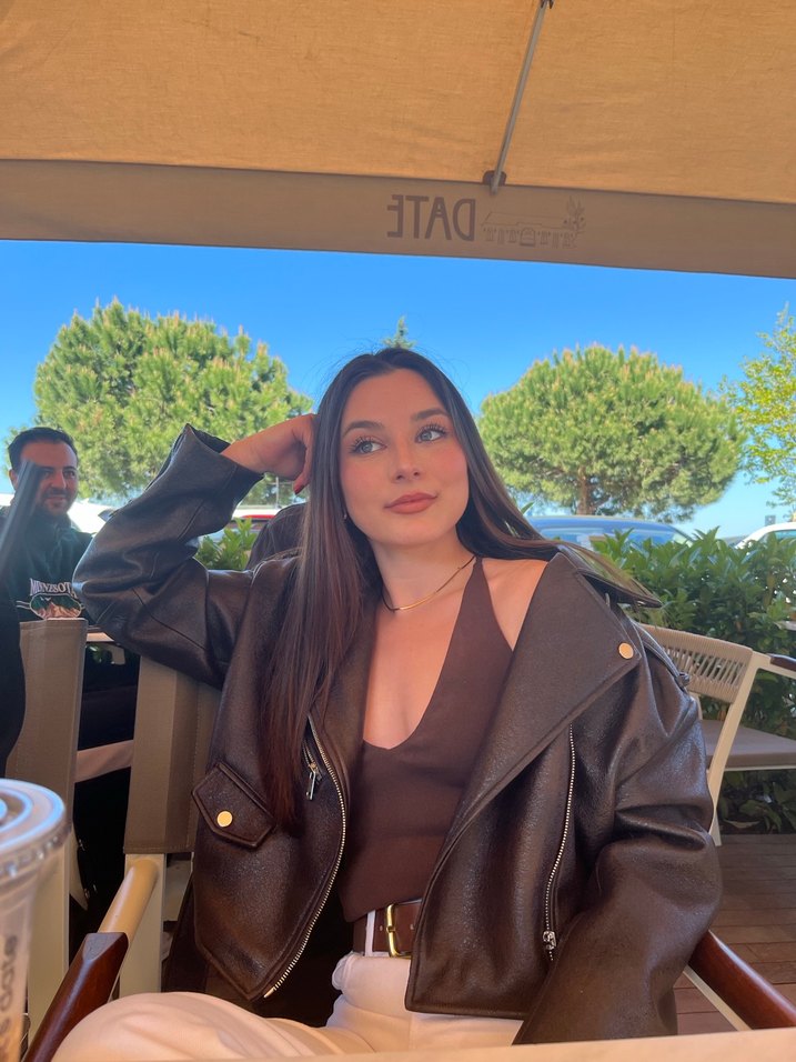 Bol kesim, kahverengi deri ceket, yakalı ve tokalı detaylı. Uzun kollu ve parlak görünümlü, sokak stili için uygun.