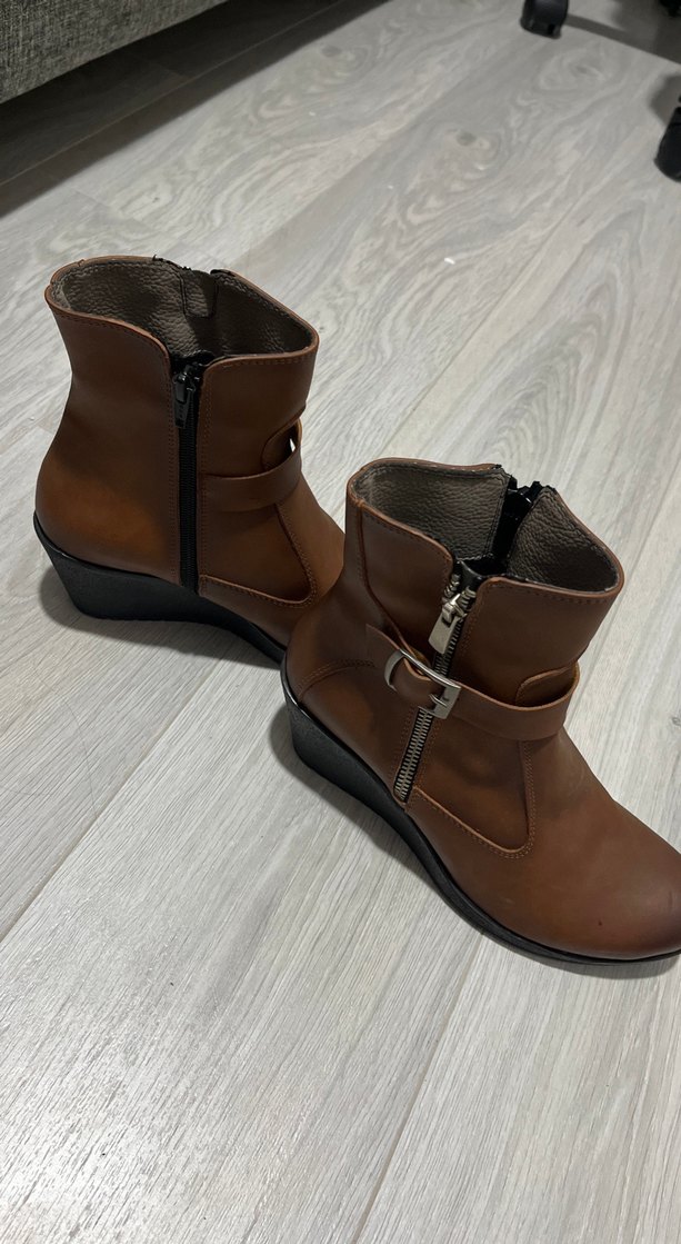 Hiç kullanılmadı markasını bilmiyorum yazmıyor. Kahverengi deri kadına özel dolgu topuklu, tokalı ve fermuarlı botlar, rahat biker tarzıyla günlük kullanıma uygun.