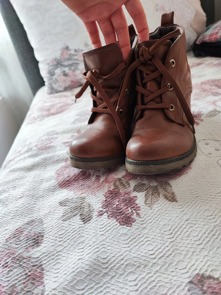 Kahverengi deri dolgu topuklu, tokalı kadın botları. Desensiz, rahat ve bohem tarzda, günlük kullanıma uygun yeni görselde göründüğü gibi