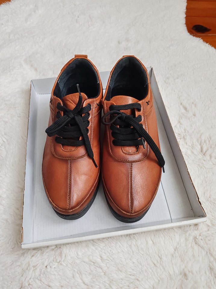 Kahverengi deri kadın günlük ayakkabılar, minimalist tasarımlı ve siyah bağcıklıdır. 37 numaradır, derisi oldukça yumuşak ve rahattır. Platform ölçüleri görselde mevcuttur. Günlük sokak stili için zahmetsiz şıklık sunar. Çok az kullanıldı.