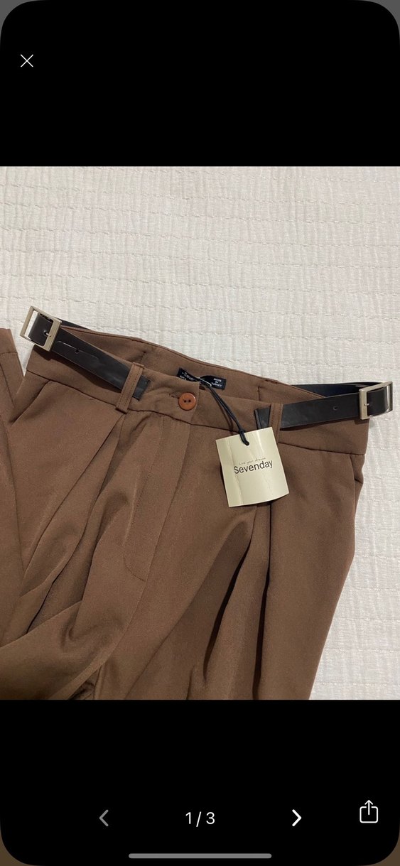Kahverengi, normal boy midi kadın pantolon, deri kemerli ve regular fit. Günlük kullanıma uygun sade normcore tarzda. Etikette 'Sevenda' yazıyor.