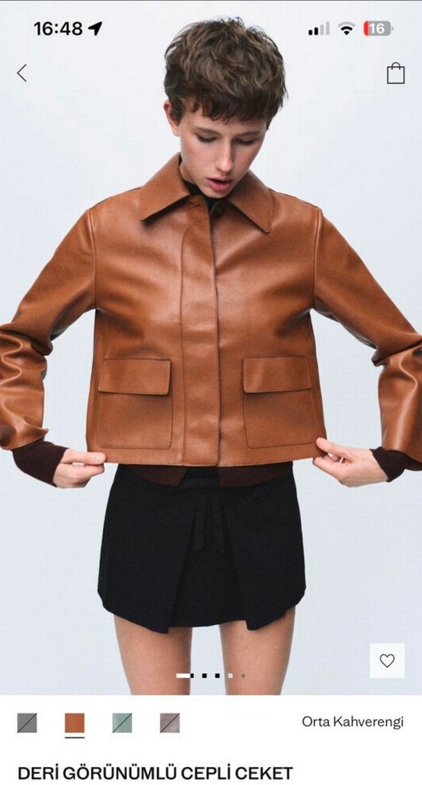 Kahverengi deri kısa ceket, yakalı ve düğmeli ön detaylıdır. Uzun kollu, regular fit ve minimalist sokak tarzına uygundur.