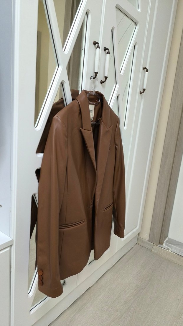 Kahverengi deri midi ceket, çentikli yaka ve tokalı detaylara sahiptir. Uzun kollu ve regular fit olup ofis veya günlük kullanıma uygundur. Kendime yakıştıramadığım için giymedim. Sorunsuzdur