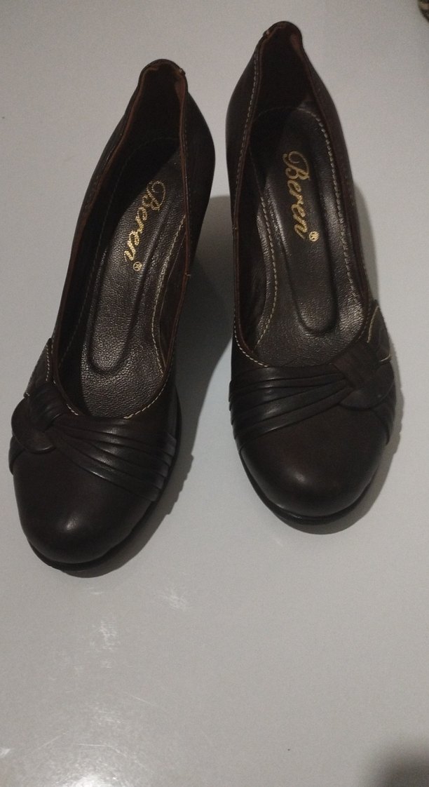 Kahverengi kauçuk malzemeden, dolgu topuklu ve tokalı klasik kadın ayakkabısı. Ofis için modern klasik tarzda uygun. hiç kullanılmadı