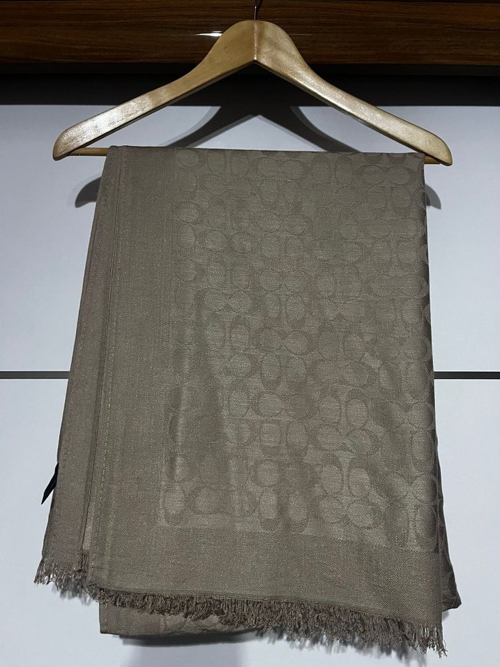 Kahverengi kadın şal, yumuşak sentetik kumaştan drapeli tasarıma sahip. İnce desenli ve püsküllü kenarlarıyla rahat ve çağdaş bir stil sunar.