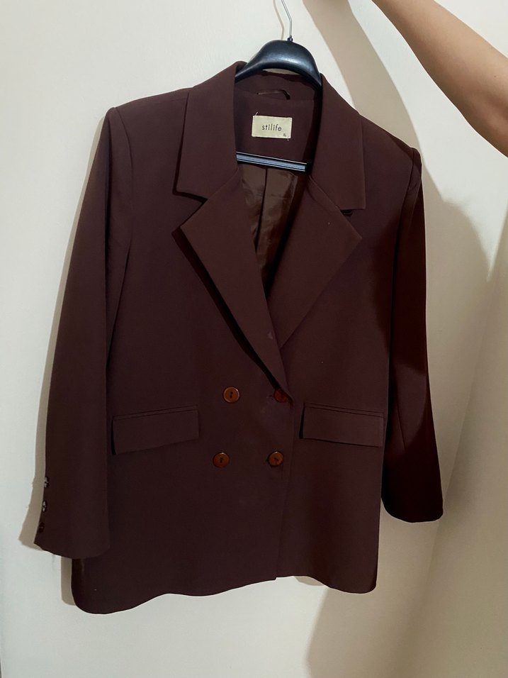 Kahverengi, düğmeli, normal boy midi kadın blazer. Notch yaka ve uzun kollu, klasik ve modern tarzda, ofis için uygundur.