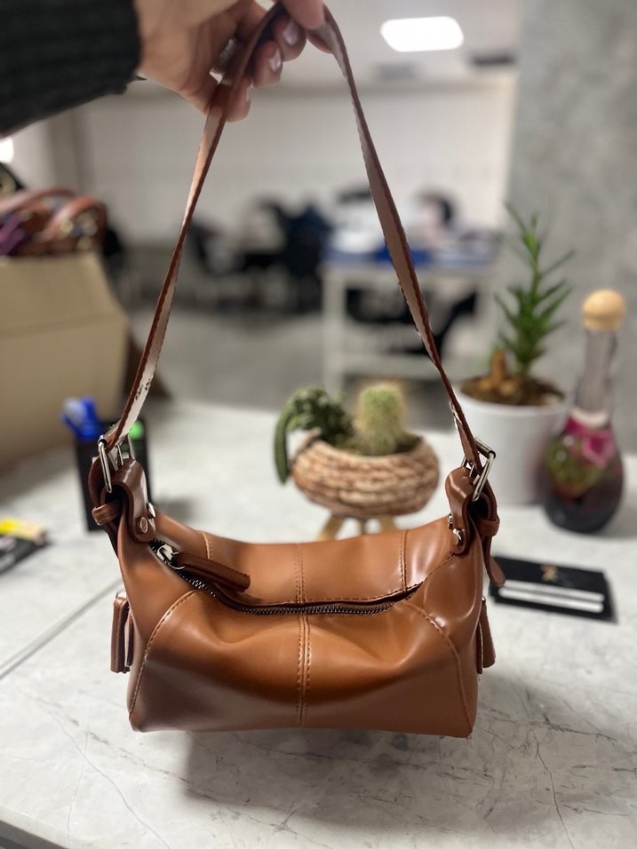 Kahverengi, parlak deri kadın el çantası, tokalı detaylara sahip, günlük kullanım ve trend sokak stili için uygundur. YAN KOL DÜĞMELERİNDEN 1 tanesi DÜŞMÜS FİYAT UYGUN TUTULMUSTUR