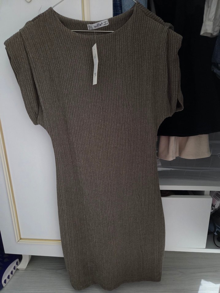 kahverengi elbise, yumuşak sentetik kumaştan üretilmiştir. Midi boyda, günlük kullanıma uygun rahat bir tarza sahiptir.