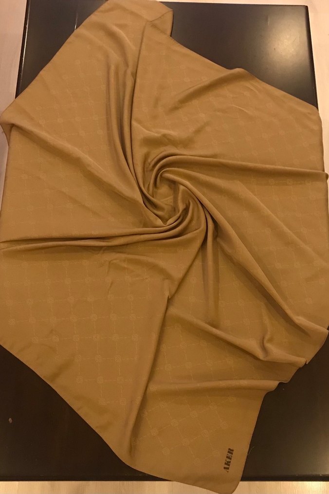 Drapeli tasarıma sahip, açık kahverengi aker kadın eşarp. Dördünvü fotoğrafta gözüktüğü gibi küçğk kusurları var.