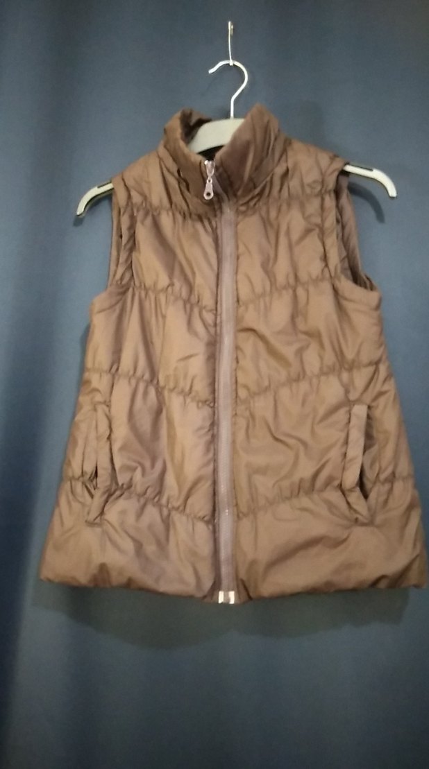 Yüksek yakalı, fermuarlı, kahverengi renkli, kolsuz yelek. Yumuşak sentetik kumaştan, midi boy ve dar kesim, rahat sokak stili için uygun.