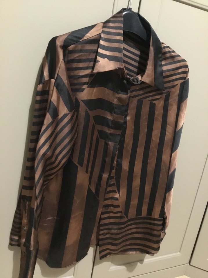 Kahverengi uzun kollu kadın gömlek. regular fit ve yakalı model, saten kumaştan spor ve şık gömlek