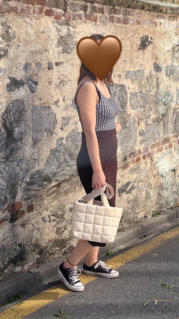 Krem sentetik kumaştan, kare desenli kadın tote çanta. Günlük kullanıma uygun, trend sokak stiline uyumlu, zahmetsiz şıklık sunar. Çok az kullanıldı.