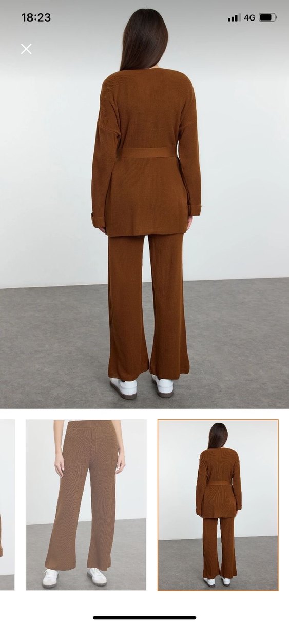Kahverengi kadın takımı, normal kesim ve midi boyda, uzun kollu ve yakası kesik detaylıdır. Düz, sentetik kumaştan yapılmış olup günlük kullanıma uygun, zahmetsiz şıklık sunar. Minimalist sokak stili için uygundur.
