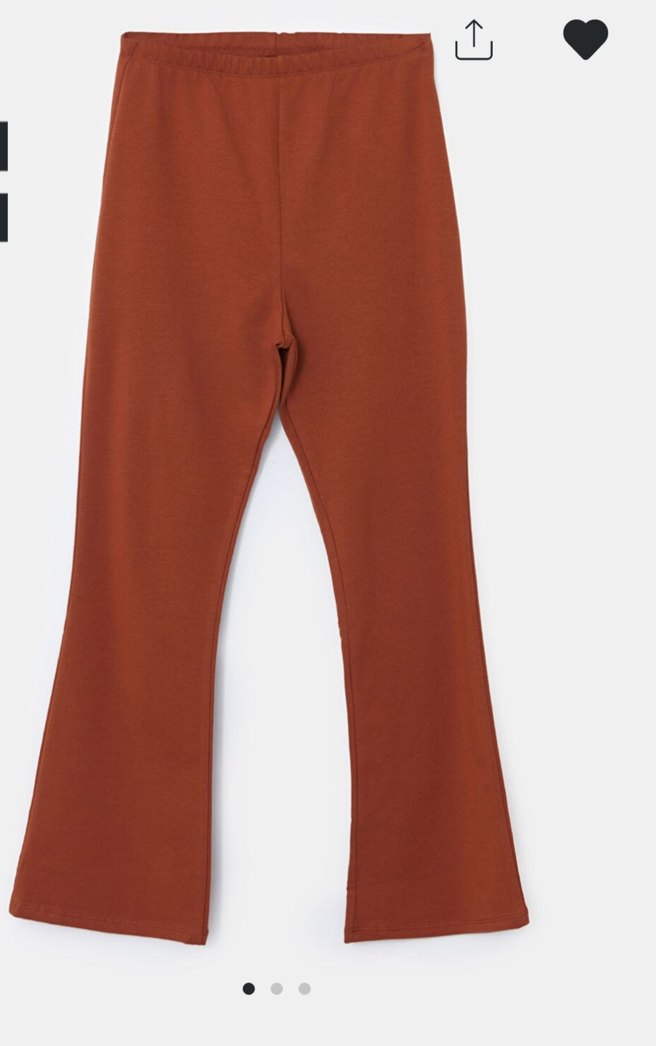 Parlak kahverengi, düz desenli ispanyol paça pantolon, rahat ve şık bir görünüm sunar. Günlük kullanıma uygun, sentetik kumaştan yapılmıştır.