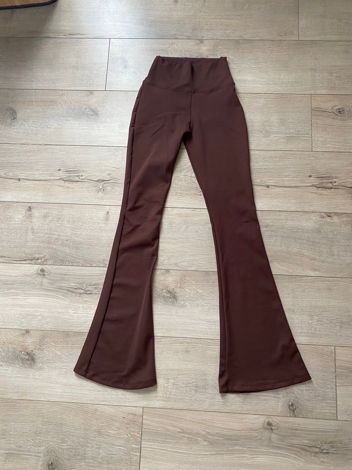 Kahverengi, vücuda oturan ispanyol paça pantolon, midi boy ve yumuşak sentetik kumaştan, günlük rahat kullanıma uygun şık bir tasarıma sahiptir.