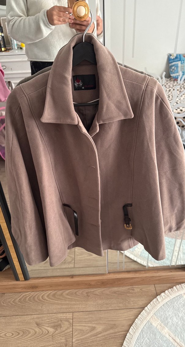 Geniş yakalı kahverengi kadın kaban, ceplerinde dekoratif tokalar bulunur. Düz ve şık tasarıma sahiptir.