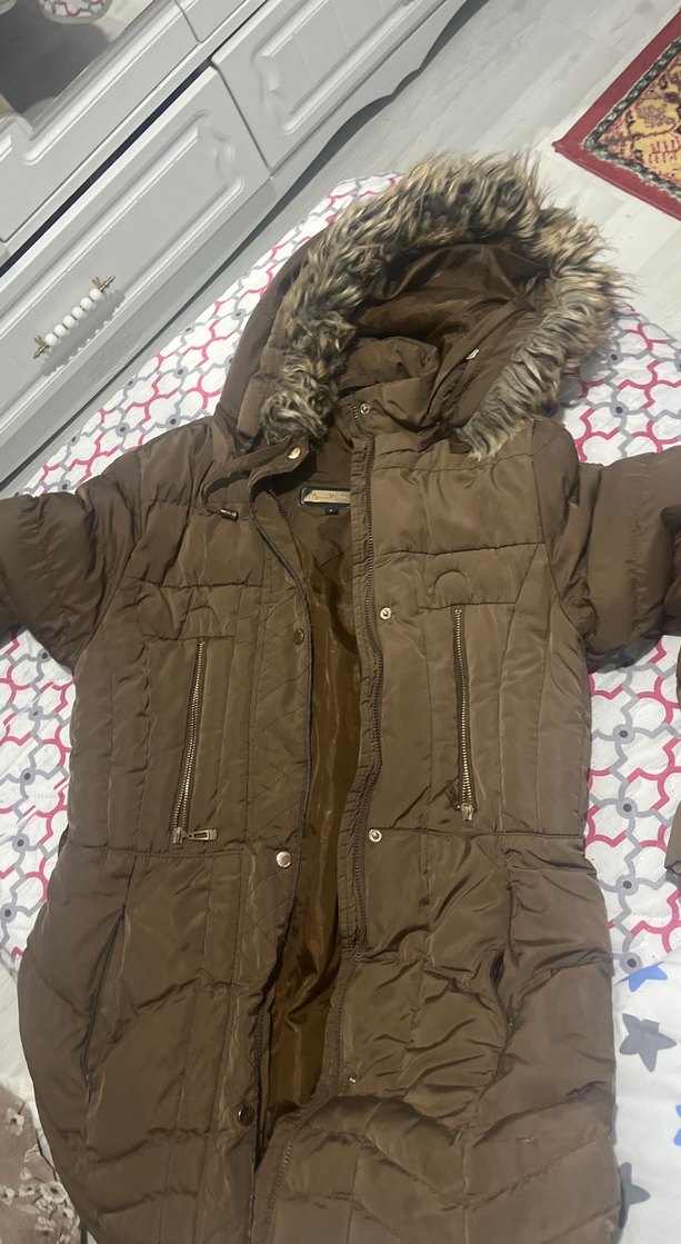 Kahverengi, kürklü kapüşonlu, uzun kollu, midi boy, vücuda oturan kış montu. Yumuşak sentetik kumaştan, rahat ve şık dış mekan kullanımı için uygun.