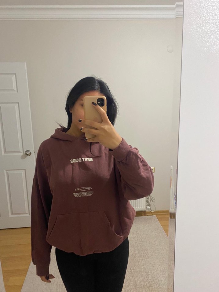 Bu kahverengi kadın kapüşonlu sweatshirt, bol kesim ve uzun kolludur. Yumuşak ve sıcak kumaştan üretilmiştir, günlük rahat kullanım için uygundur.
