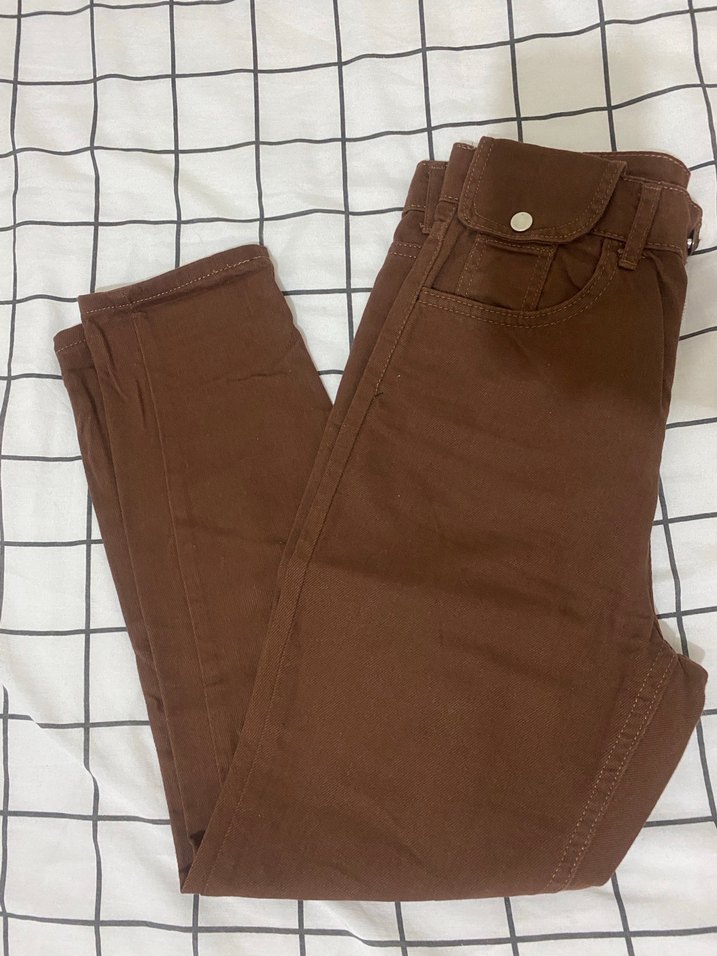 Kahverengi, kemerli, normal kesim ve normal boyda pamuklu kadın pantolonu. Günlük kullanıma uygun, desensiz sade tasarım.