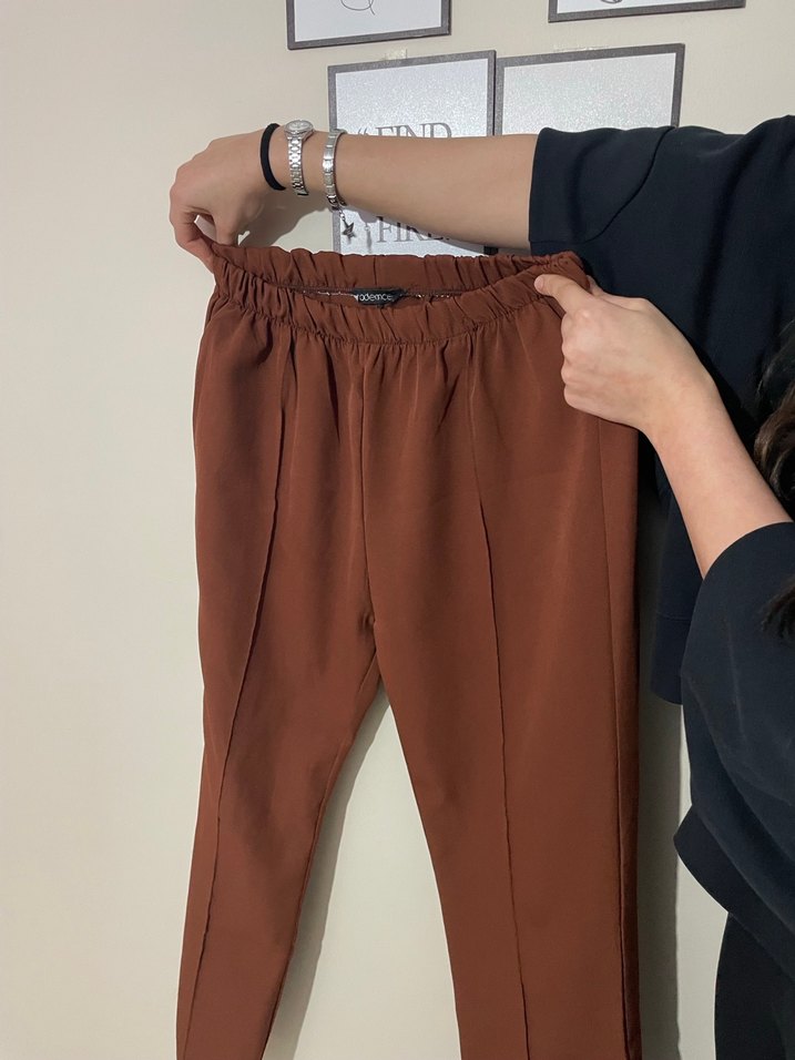 Kahverengi kadın pantolon, kemerli ve bol kesim olarak tasarlanmıştır. Orta boy ve sentetik kumaştan yapılmıştır, günlük rahat kullanım için uygundur.