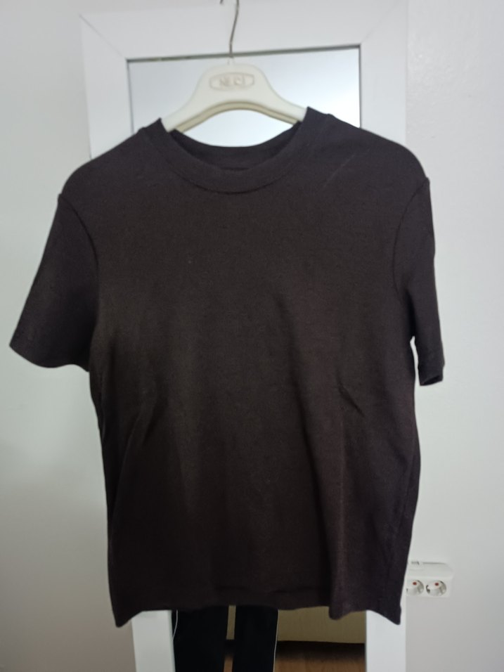 kahverengi kısa kollu, bisiklet yaka ve dar kesim kadın tişörtü. Sentetik kumaştan üretilmiş, minimalist ve günlük kullanıma uygun sokak tarzında. ✨