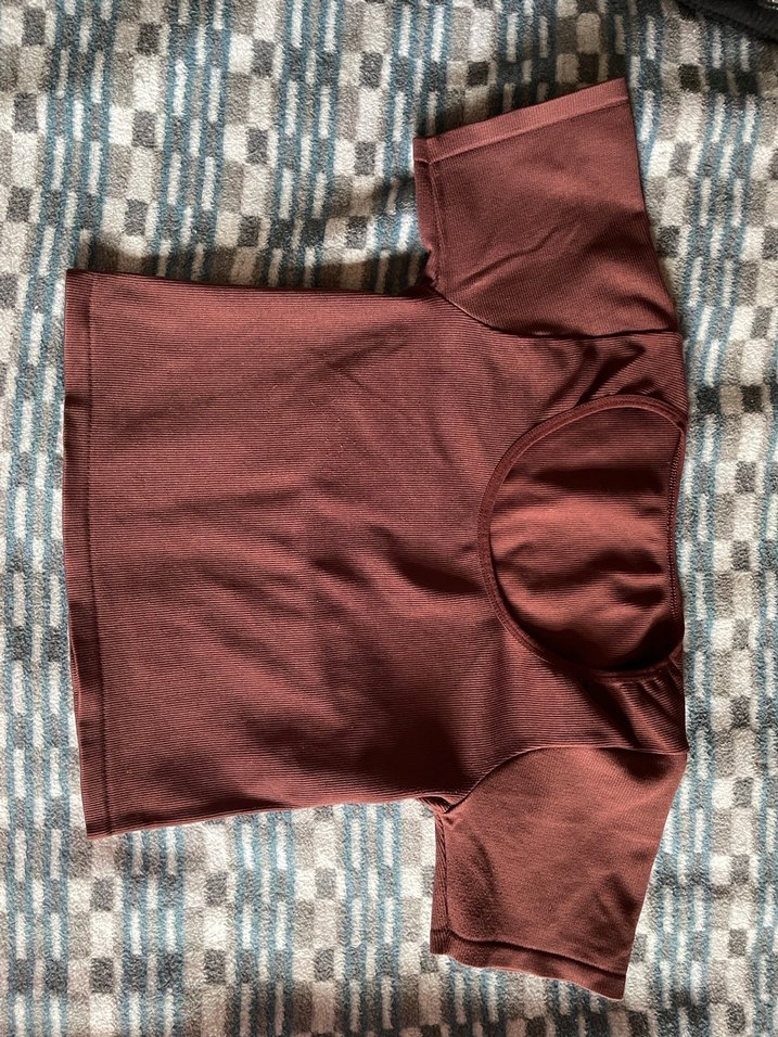 Kahverengi, kısa kollu, fitted kesim kadın tişörtü, tek renk ve tekne yakalıdır. Pürüzsüz sentetik kumaştan yapılmıştır, günlük kullanıma uygundur.