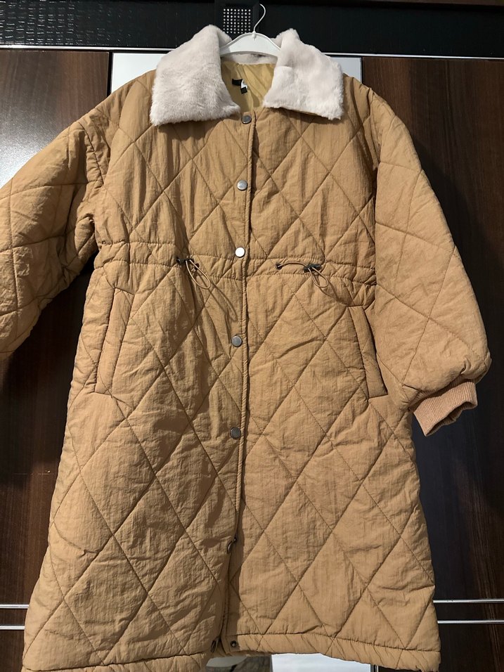 Kahverengi, parlak görünümlü kadın kışlık mont; kürklü, kesik yaka, uzun kollu ve normal kesim. Midi boy, kapitone dikişli, fermuarlı ceplidir. ❄️
