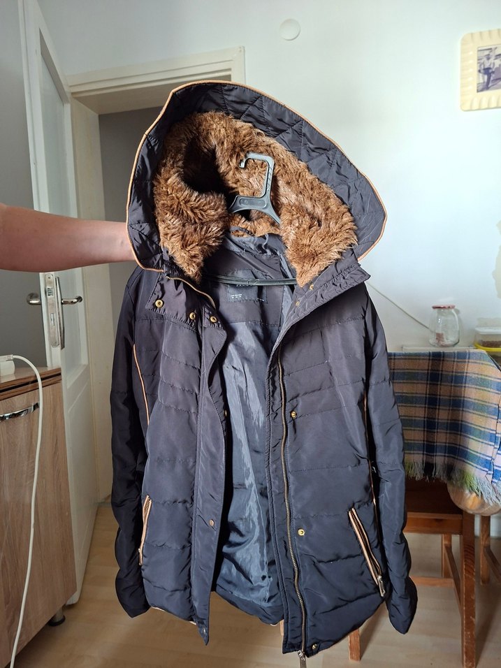 Fermuarlı, kahverengi, uzun kollu, kürk detaylı kapüşonlu, rahat kalıp, midi uzunlukta kadın kışlık mont.