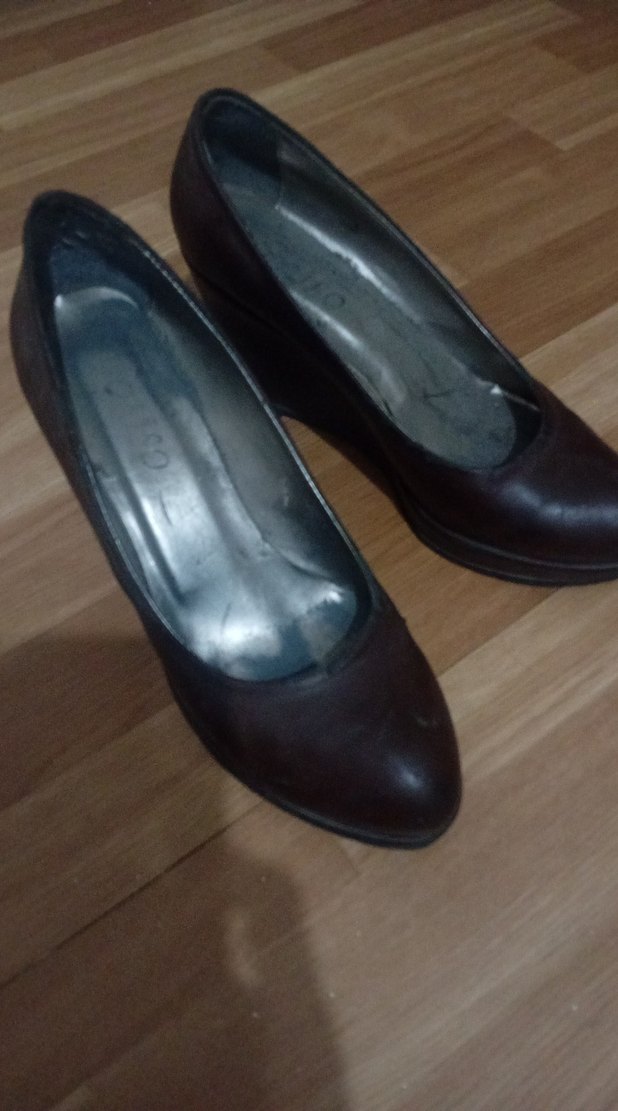 Koyu kahverengi, dolgu topuklu kadın klasik ayakkabılar. Kauçuk malzemeden, tokalı detaylı ve ofis için uygundur. Gotik tarzda.beklemeye bağlı hafif dökülmeler var bu haliyle bile günü kurtarır acı kahve