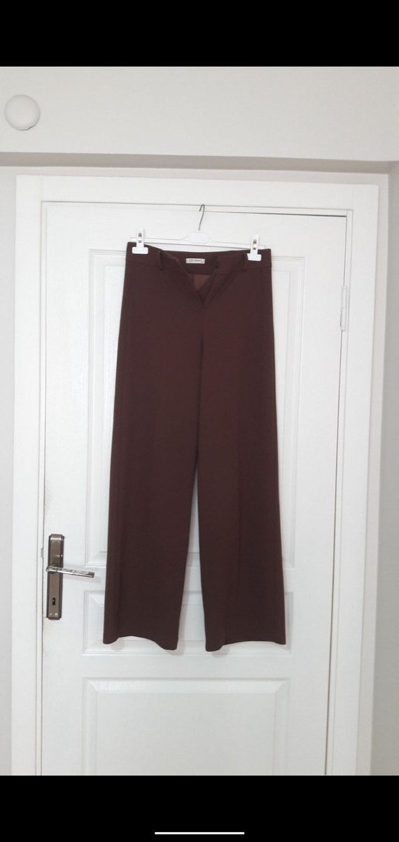 Kadınlar için kahverengi midi uzunlukta, normal kesim ve ipeksi dokulu kumaş pantolon. Ofis kullanımı için sade ve normcore tarzda. ✨