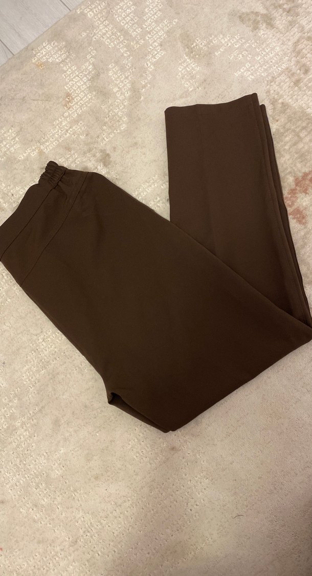 Kahverengi kumaş pantolon, düz ve desensiz tasarımıyla minimalist ofis stiline uygundur. ✨