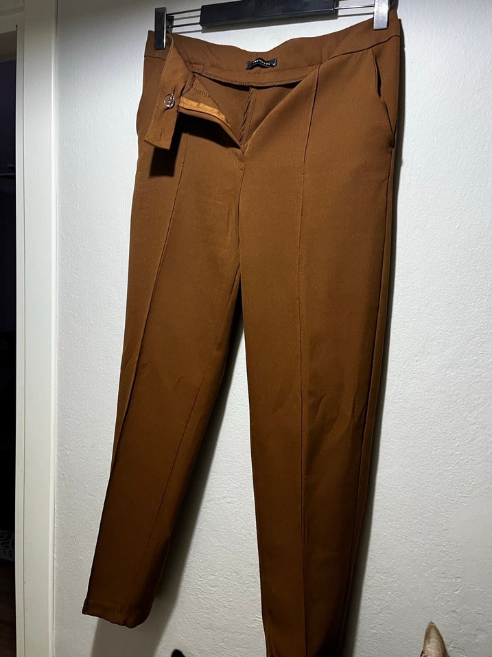 Kahverengi, regular fit kadın kumaş pantolon. Midi boy, ofis için uygun, koyu renkte ve desensiz tasarım. Fazlalık sebebi ile satışta ‘ oturuşu mükemmeldir