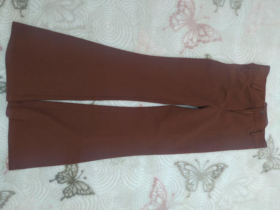 Kahverengi, midi boy, kemerli ve dar kesim kadın kumaş pantolon. Günlük sokak giyimi için uygun, minimalist tarzda, sentetik kumaştan.Sadece kemeri eksik sorunsuz temiz.
