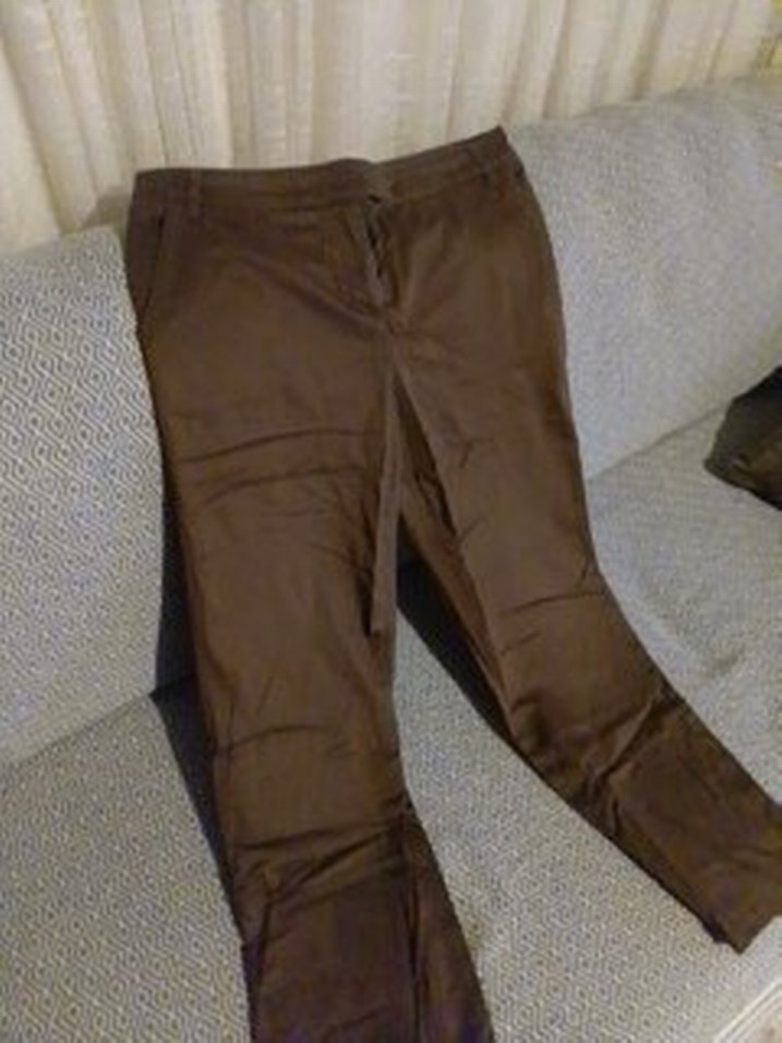 Kahverengi, kemerli, normal boy midi uzunlukta, rahat kalıplı, ipeksi dokulu kadın kumaş pantolon. 42 beden