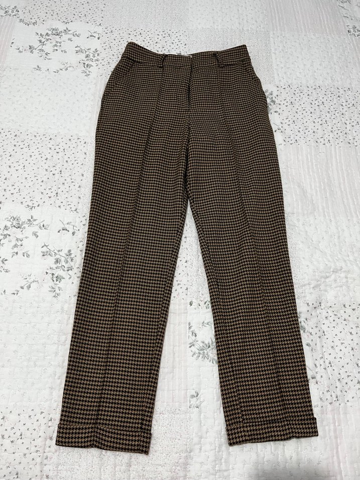 Kahverengi, midi boy, regular fit kadın kumaş pantolon. Dantel detaylarıyla ofis kullanımına uygun, koyu renkli ve klasik desenli Paris tarzı.
