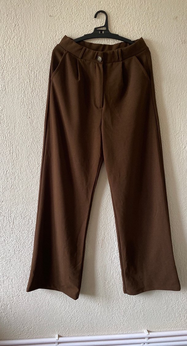 40 beden kahverengi, düz desenli kadın kumaş pantolon. Geniş paça ve normal bel kesimlidir. Orta kalınlıkta, astarsız ve esnek yapıda %100 polyester kumaştan üretilmiştir. Neredeyse hiç giyilmedi, tertemiz durumda. Herhangi bir yırtık, leke veya deformesi yoktur. Hem günlük hem ofis kombinleri için uygundur