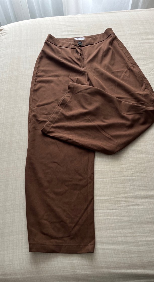 Kahverengi kadın kumaş pantolon, normal boy ve regular fit. Sentetik kumaştan, ofis için minimalist normcore tarzda. ✨