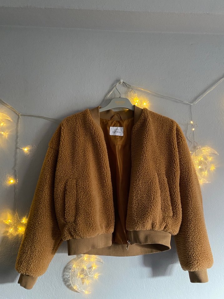 Kahverengi midi ceket, bol kesim, uzun kollu ve yuvarlak yaka. Yumuşak ve sıcak kumaştan, kürklü detaylı, günlük rahat stil için uygun.