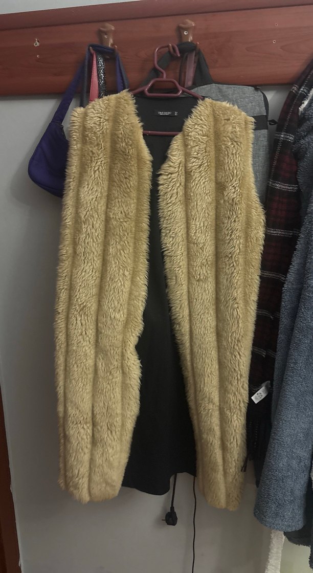 Kahverengi, kolsuz, yumuşak sentetik kürk detaylı, fitted kesim ve midi boyda, straplez yakalı kadın yelek.