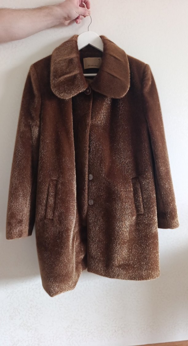 Kahverengi, kürk detaylı, midi boy, normal kesim, uzun kollu kadın kaban. Notch yakalı, yumuşak ve sıcak dokulu kumaştan, ofis kullanımına uygun.