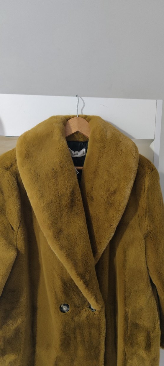 Kahverengi midi boy suni kürk ceket, parlak ve yumuşak fleece kumaştan, notched lapel yaka ve uzun kollu, bol kesim rahat bir tarz sunar.