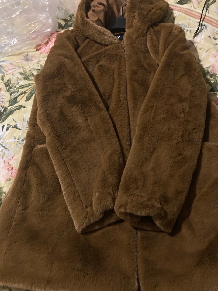 Kahverengi midi boy, bol kesim ve uzun kollu kadın mont. Yumuşak fleece ve kürk detaylı, kesik yaka ile bohem ve retro tarzına uygun. Günlük kullanım için ideal.