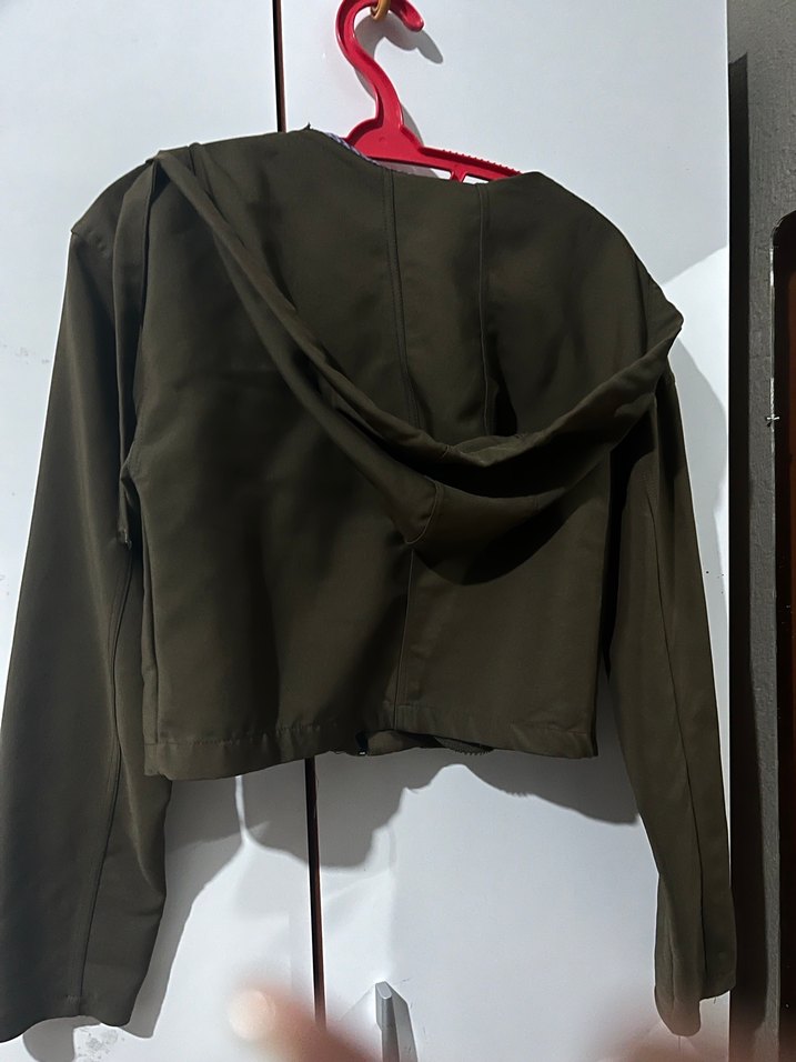 Kahverengi, uzun kollu, V yakalı, drapeli tasarıma sahip, sentetik kumaştan yapılmış, sade ve şık kadın midi ceketi.