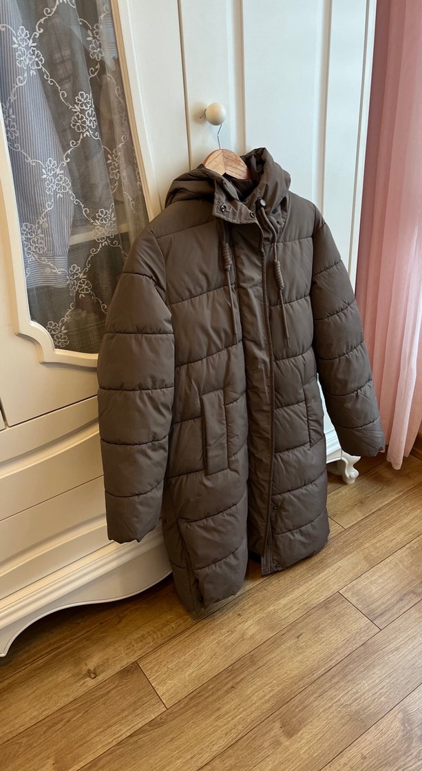Kahverengi, kapüşonlu, fermuarlı, uzun kollu, midi boy kadın kaban. Sıcak tutan yumuşak kumaştan, sokak stiline uygun.