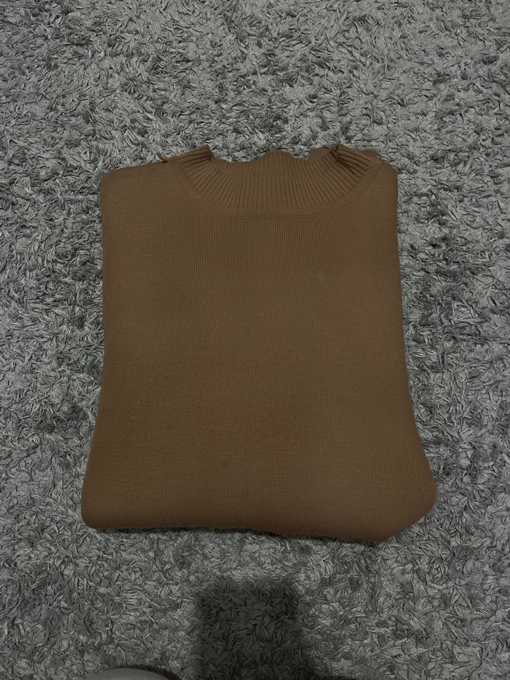 Kahverengi kadın kazağı, yuvarlak yaka ve uzun kolludur. Yumuşak sentetik kumaştan yapılmış, kürk detaylıdır. Günlük kullanıma uygun, midi boy ve regular kesimdir.