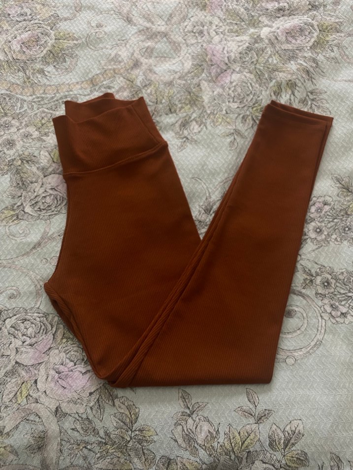 Sentetik kumaştan, günlük sokak modası için şık kahverengi midi tayt. Trendy rahat athleisure tarzına uygun, vücuda oturan kesim.