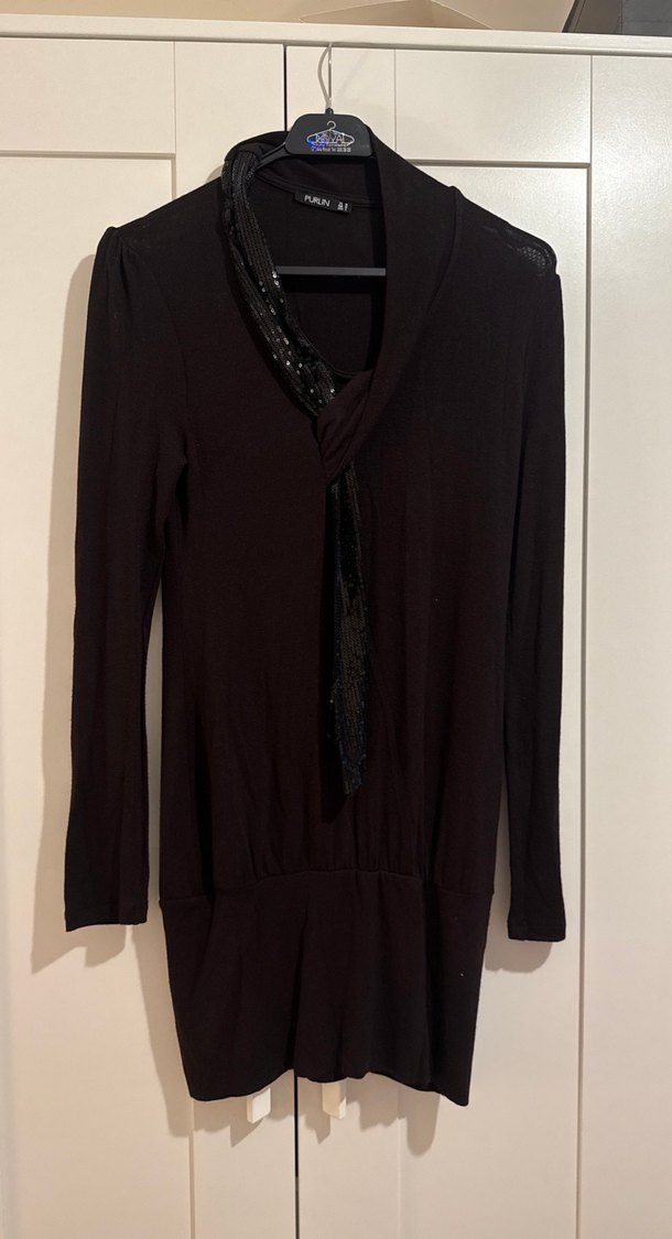 Siyah, uzun kollu ve yakalı, midi boy triko elbise. İnce kesimli, ipeksi dokulu ve taş detaylıdır. Ofis için uygun, gotik tarzda bir parça.