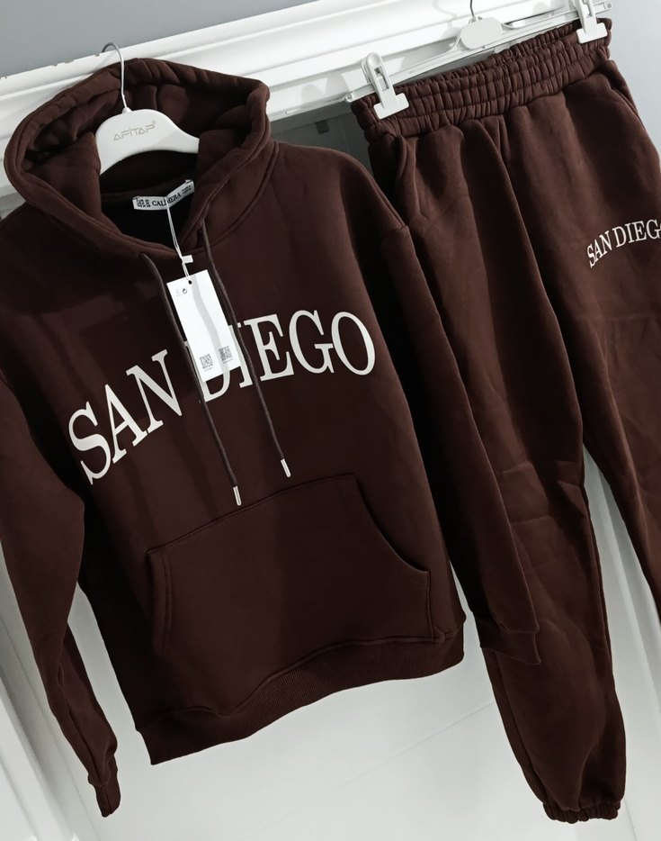 Kahverengi, uzun kollu, 3 iplik kumaştan kadın eşofman takımı. "SAN DIEGO" baskılı, rahat ve şık sokak stili görünümü sağlar. Günlük kullanım için uygundur. s m beden uygun